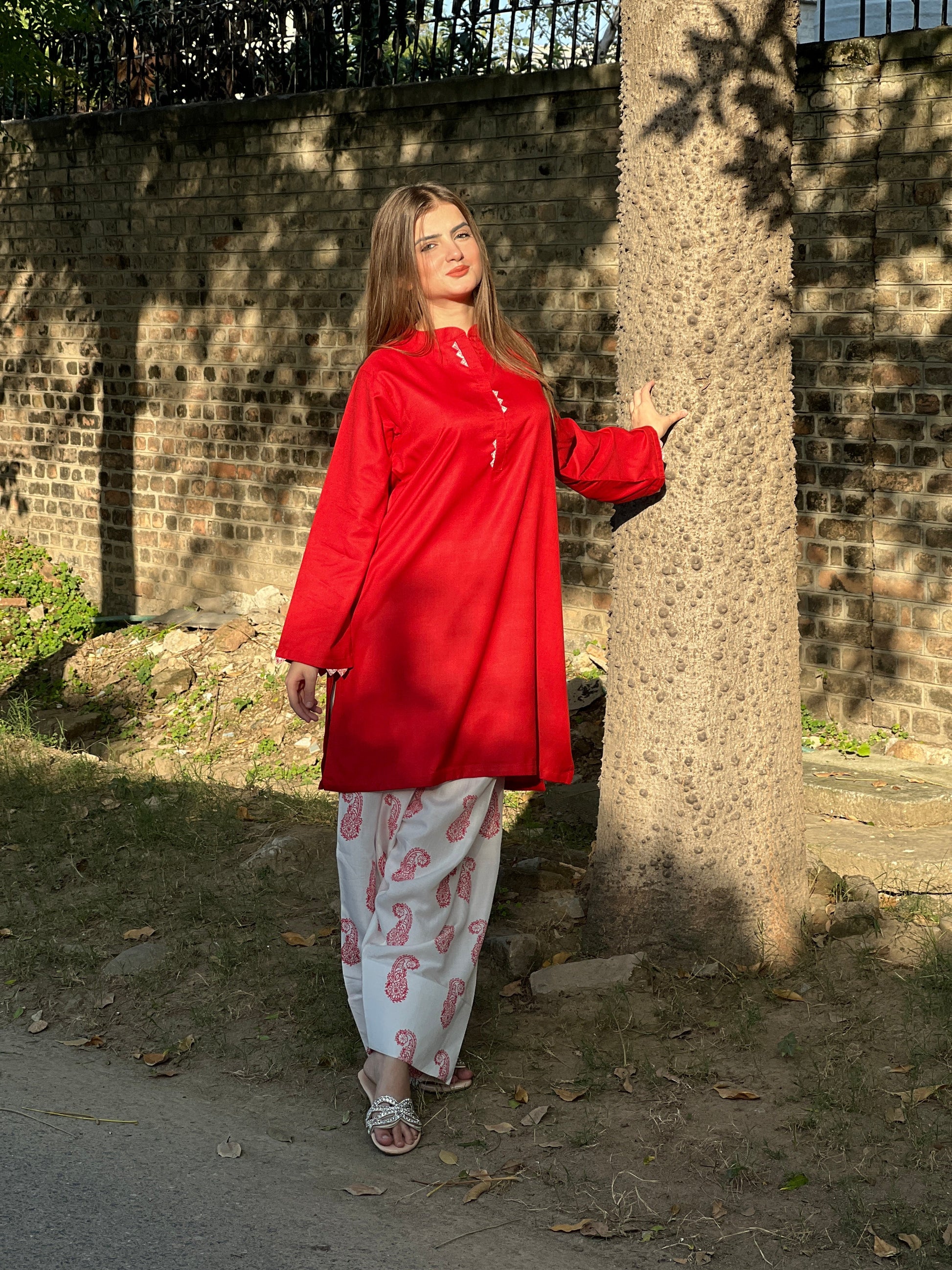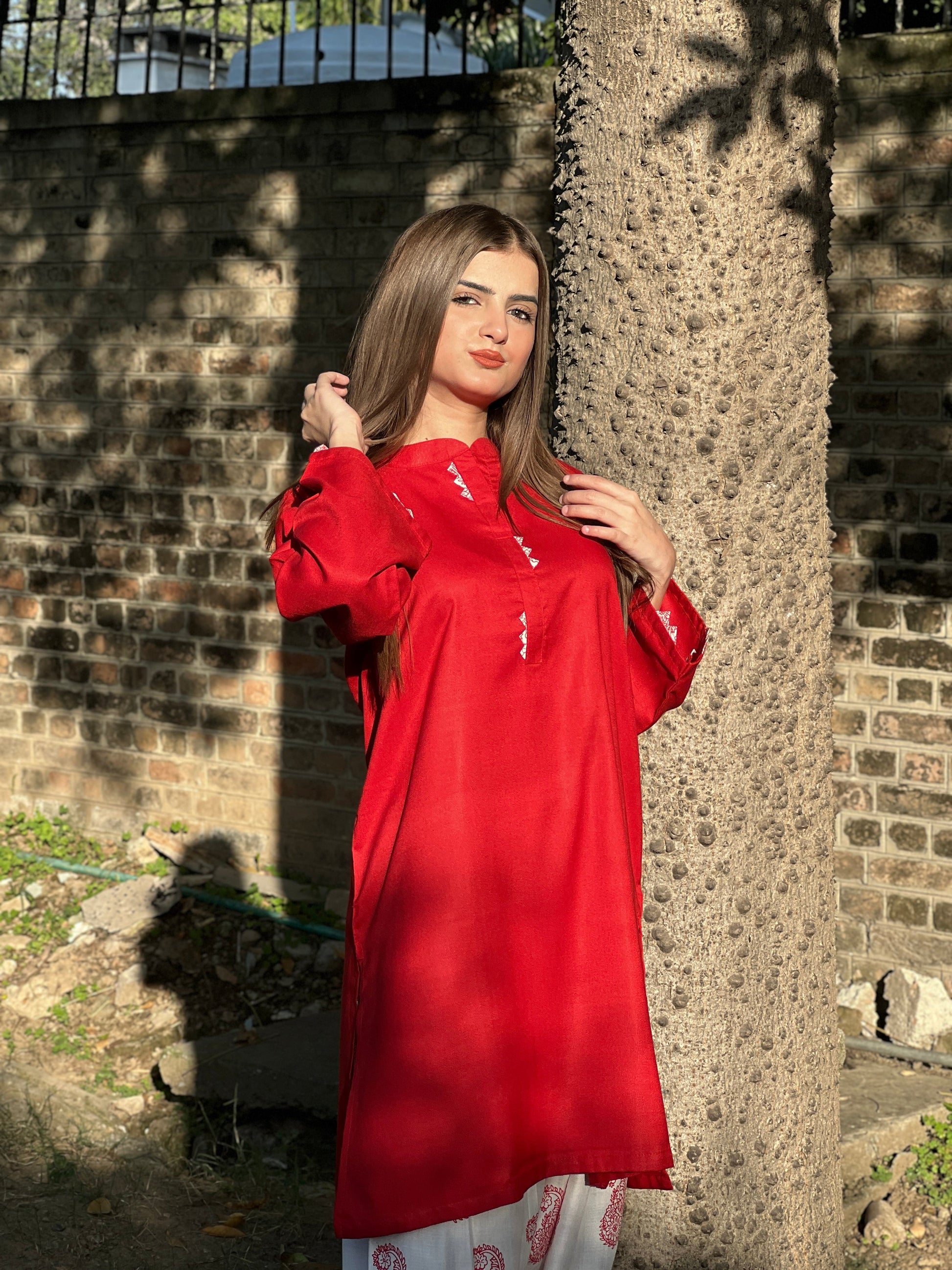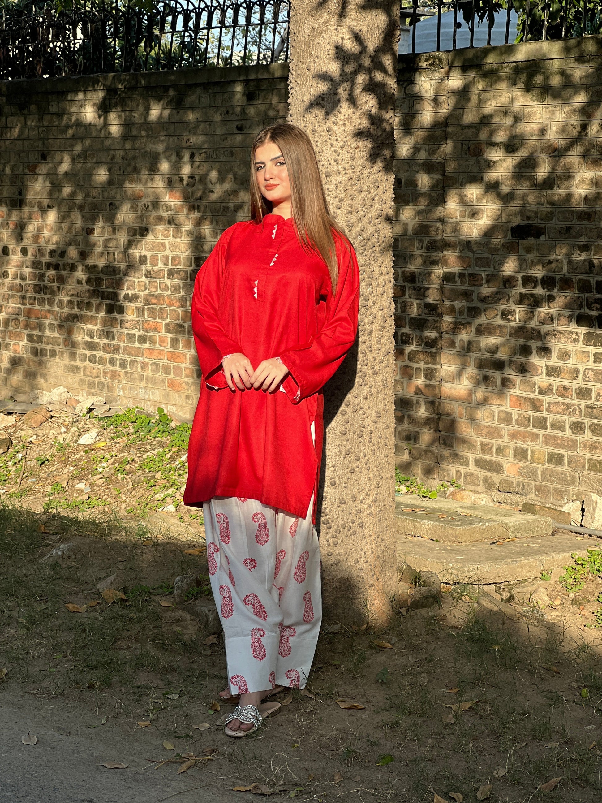 This exquisite Daily/Basic Wear Kurta Set is perfect for winter wear. Made from Dhanak fabric, the straight-cut kurta comes in a stunning white color, while the linen trousers are a striking red. The 2-piece set features no lining and is ideal for all occasions. Elevate your wardrobe with this chic ensemble from B.K Clothings.