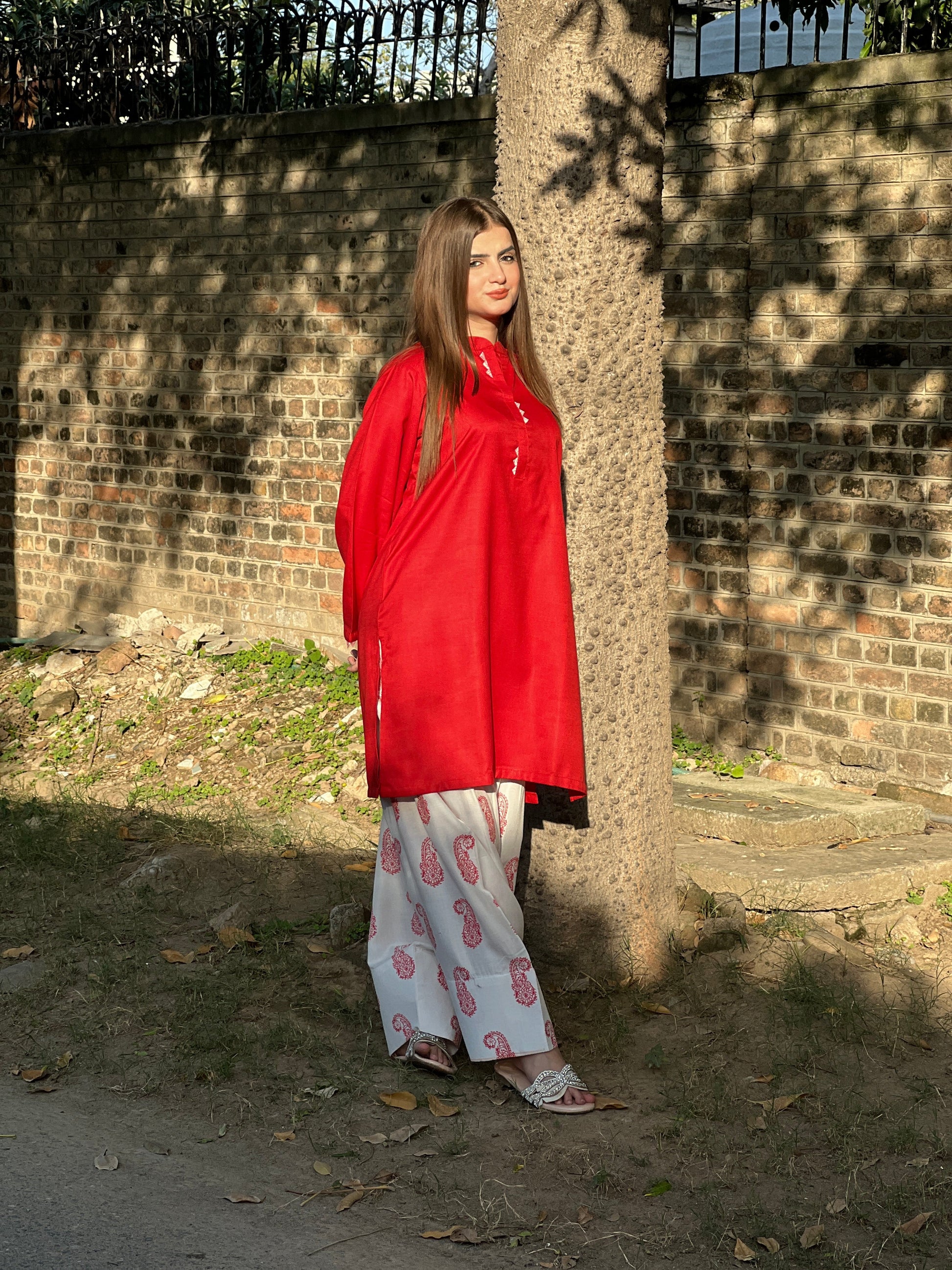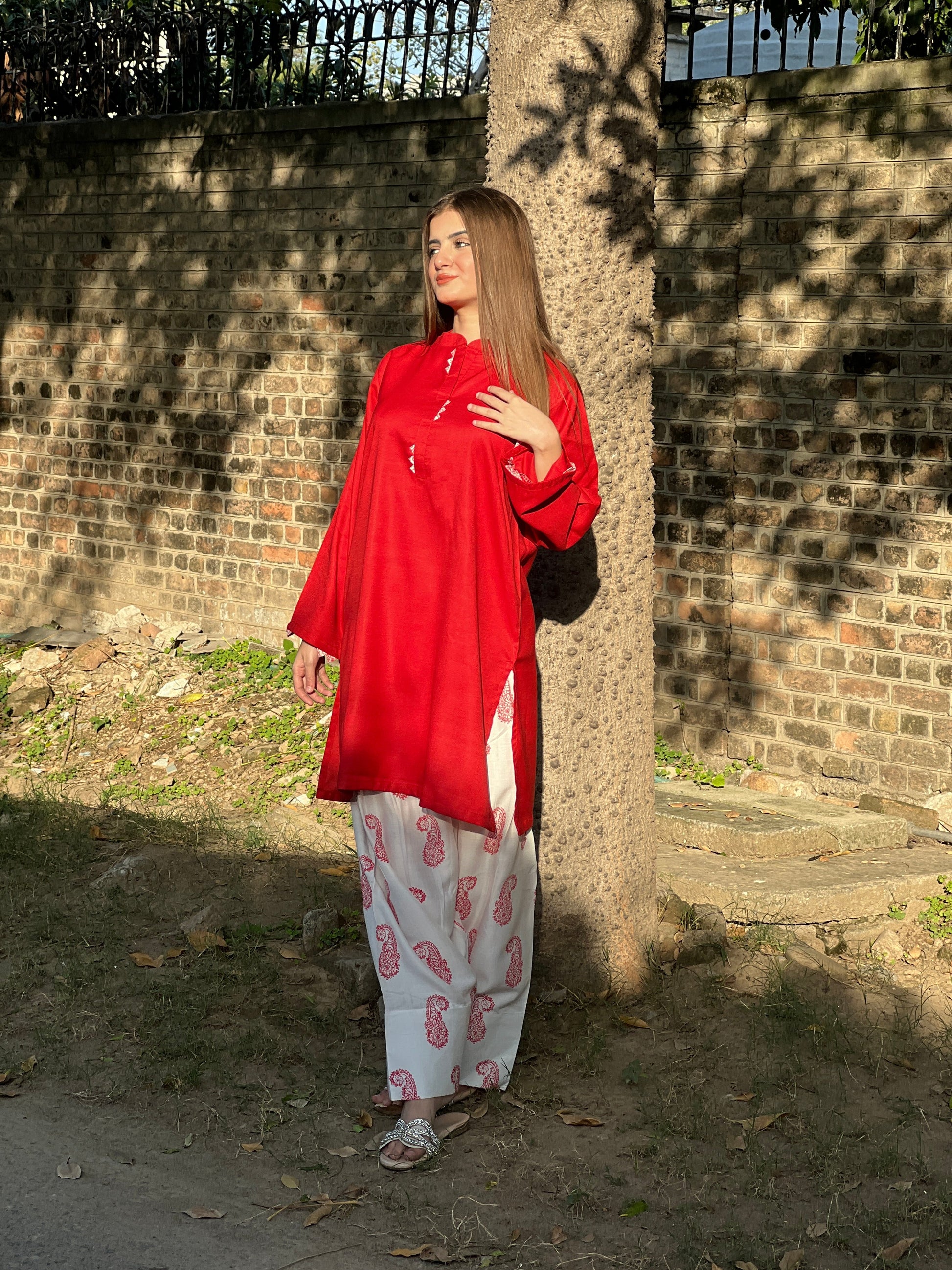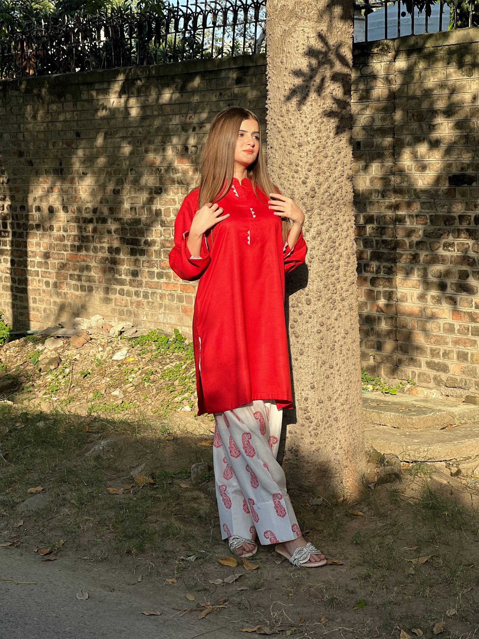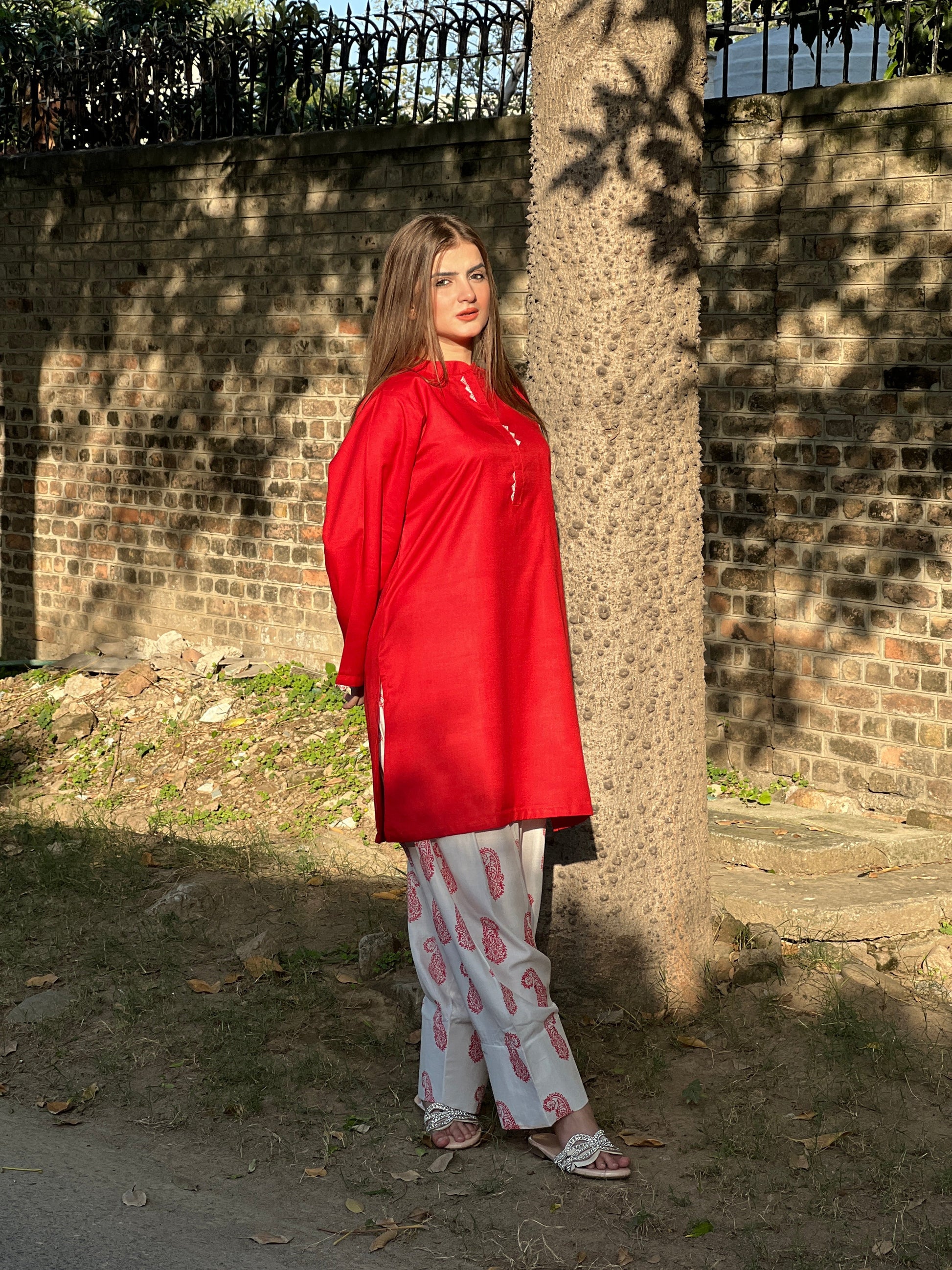 This exquisite Daily/Basic Wear Kurta Set is perfect for winter wear. Made from Dhanak fabric, the straight-cut kurta comes in a stunning white color, while the linen trousers are a striking red. The 2-piece set features no lining and is ideal for all occasions. Elevate your wardrobe with this chic ensemble from B.K Clothings.